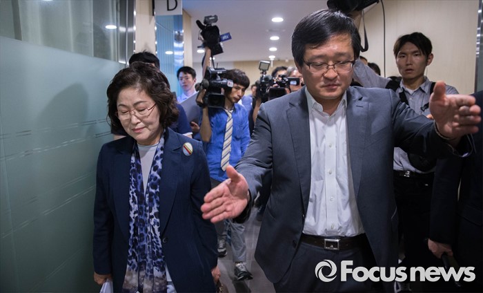 (서울=포커스뉴스) 28일 오후 서울 서대문구에 위치한 '화해·치유 재단' 사무실 인근에서 열린 기자간담회에 참석한 김태현 이사장이 취재진의 질문을 거부하고 간담회장을 빠져나오고 있다.