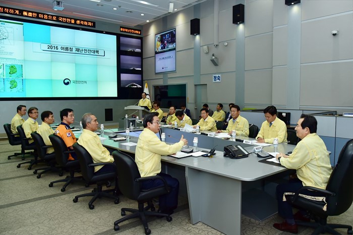 (서울=포커스뉴스) 정세균 국회의장이 28일 오전 정부서울청사 국민안전처 중앙재난안전상황실을 방문해 박인용 국민안전처 장관 등 관계자로부터 여름철 안전대책 보고를 받고 있다. <사진제공=국회>