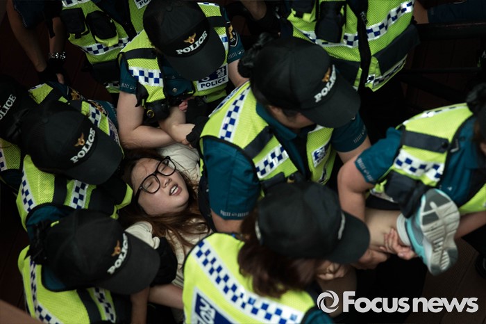 | △ 점거 농성 중 건물 밖으로 연행되는 대학생 |