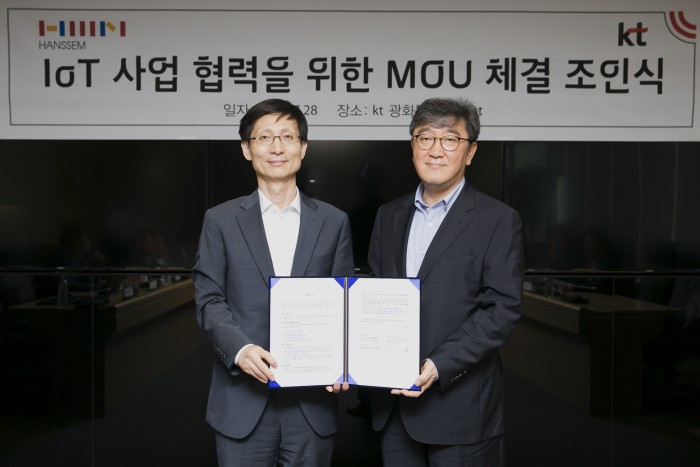 (서울=포커스뉴스) KT는 한샘과 스마트 가구 및 인테리어 사업 공동 추진과 홈 사물인터넷(IoT) 대중화를 위해 손잡는다. KT-한샘은 28일 IoT 사업협력을 위한 양해각서(MOU)를 체결했다.