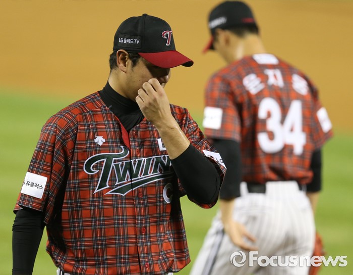 | △ 교체돼 마운드 내려가는 LG 류제국 |