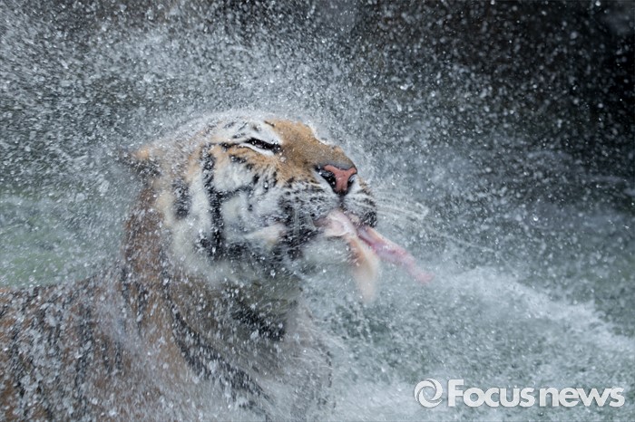 (과천=포커스뉴스) 28일 오후 경기도 과천 서울동물원에서 시베리아 호랑이가 얼린 닭고기를 먹으며 몸에 묻은 물기를 털어내고 있다.