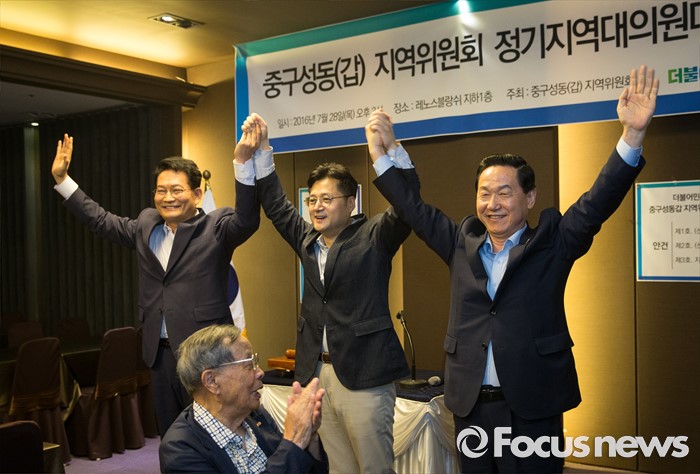 (서울=포커스뉴스) 더불어민주당 김상곤(오른쪽부터) 전 혁신위원장, 홍익표 의원, 송영길 의원이 28일 오후 서울 성동구 레노스블랑쉬 웨딩홀에서 열린 서울 중구·성동갑 지역대의원대회에서 손을 들어보이고 있다.