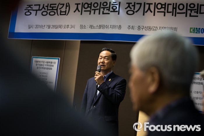 (서울=포커스뉴스) 더불어민주당 김상곤 전 혁신위원장이 28일 오후 서울 성동구 레노스블랑쉬 웨딩홀에서 열린 서울 중구·성동갑 지역대의원대회에서 발언하고 있다.