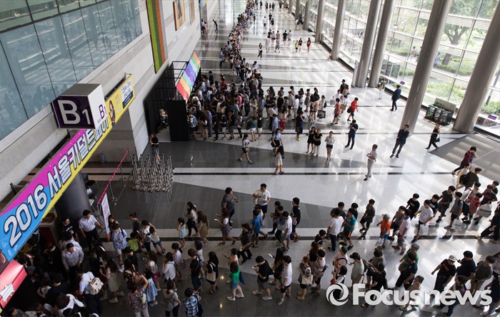 (서울=포커스뉴스) 28일 오후 서울 강남구 코엑스에서 열린 2016 서울키덜트페어를 찾은 시민들이 줄을 서 입장을 기다리고 있다. 키덜트페어는 7월 28일부터 31일까지 나흘간 진행되며 만화, 영화, 장난감 캐릭터 등이 다양한 모습으로 전시되어 있다.