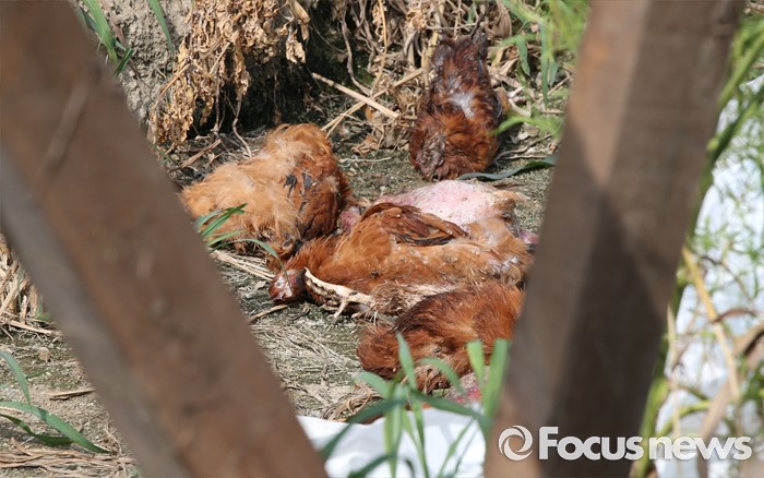 (괴산=포커스뉴스) 폭염으로 가축 폐사가 늘고있는 가운데 28일 오후 충북 괴산의 양계농가에서 닭이 폐사돼 있다.
