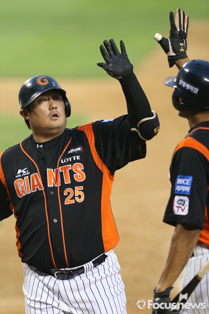 (서울=포커스뉴스) 28일 오후 서울 잠실구장에서 열린 2016 타이어뱅크 KBO리그 롯데-LG 경기에서 4회초 4번타자 롯데 최준석이 홈런을 친 뒤 동료의 축하를 받고있다.
