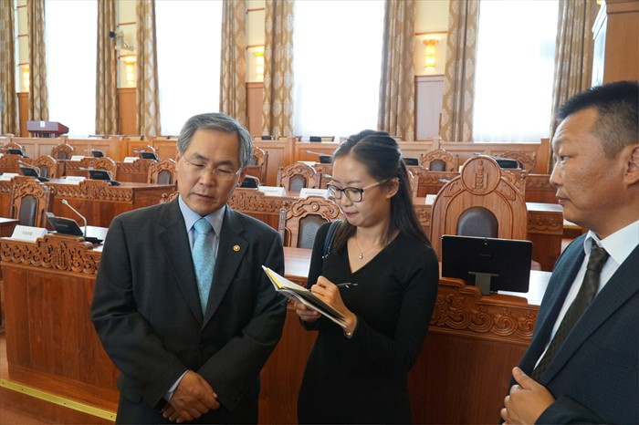 (서울=포커스뉴스) 몽골 국회 사무총장의 공식 초청으로 몽골을 방문 중인 우윤근 국회 사무총장이 28일 몽골 국회 본회의장에서 관계자로부터 설명을 듣고 있다. 이날 양국은 국회 및 사무처 간 교류 활성화를 위한 업무협약을 체결했다. <사진제공=국회사무처>