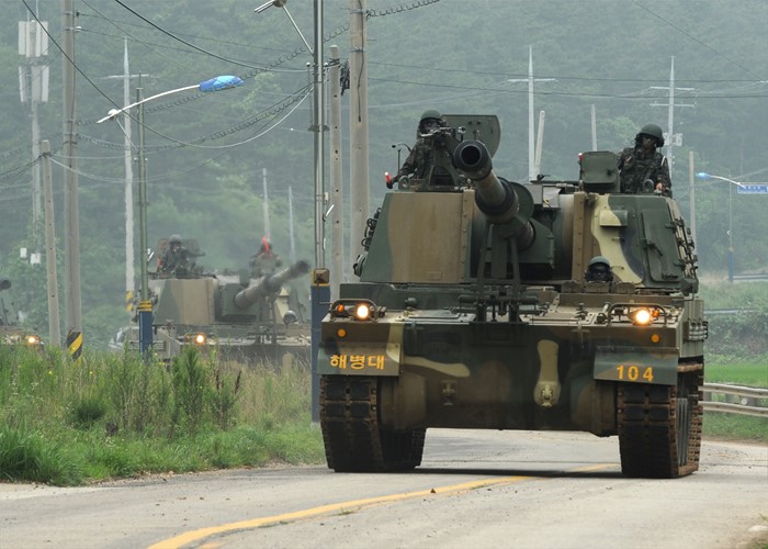 (서울=포커스뉴스) 28일 인천 백령도에서 실시된 서북도서방위사령부 해상사격에 참가한 해병대 6여단 K-9 자주포가 사격진지로 기동하고 있다. <사진제공=해병대사령부>