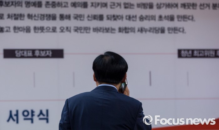 (서울=포커스뉴스) 이주영 새누리당 의원이 9일 오전 서울 여의도 새누리당사에서 열린 '4차 전당대회 혁신과 화합의 선거 서약식'에 참석해 전화통화를 하고 있다.