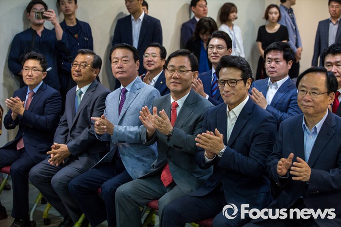 (서울=포커스뉴스) 새누리당 전당대회 당대표 후보들이 9일 오전 서울 여의도 새누리당사에서 열린 '4차 전당대회 혁신과 화합의 선거 서약식'에 참석해 박수 치고 있다. 왼쪽부터 김용태, 이정현, 한선교, 주호영, 정병국, 이주영 후보.