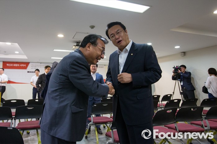 (서울=포커스뉴스) 정진석(오른쪽) 새누리당 원내대표와 이정현 의원이 9일 오전 서울 여의도 새누리당사에서 열린 '4차 전당대회 혁신과 화합의 선거 서약식'에 참석해 악수 하고 있다.