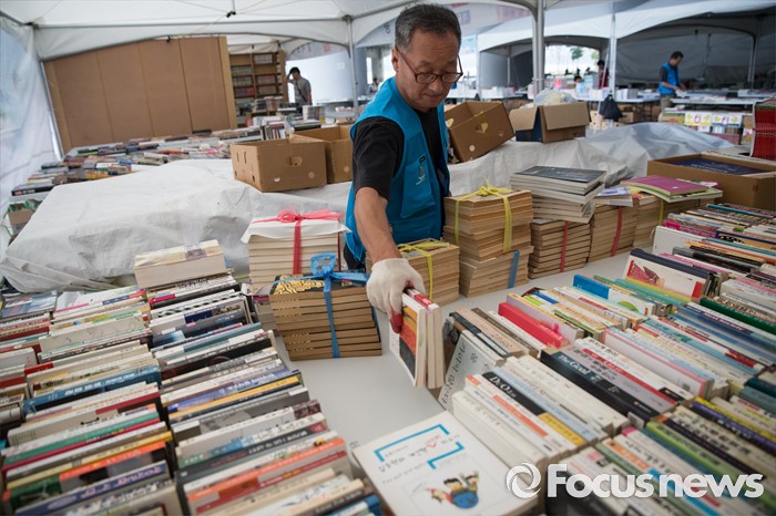 (서울=포커스뉴스) 29일 오전 서울 여의도 한강공원 마포대교 밑에서 열린 2016 한강몽땅 '지상 최대 헌책방 축제'에서 책방 주인들이 책을 정리하고 있다.