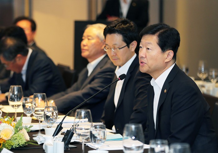 (서울=포커스뉴스) 우태희(오른쪽) 산업통상자원부 2차관이 29일 서울 중구 소공동 플라자호텔 메이플룸에서 구자철 도시가스협회장, 유승배 서울도시가스 사장, 강병일 삼천리 대표, 나성오 강원도시가스 사장, 김병표 중부도시가스 사장, 태재광 전남도시가스 사장, 김문수 제주도시가스 사장을 비롯한 도시가스사 대표, 협회, 가스공사 등 관계자 50여명이 참석한 가운데 열린 도시가스사 사장단 간담회에 참석해 인사말을 하고 있다. <사진제공=산업통상자원부>