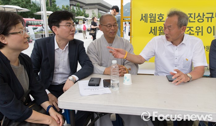(서울=포커스뉴스) 참여연대 관계자들이 29일 오후 서울 광화문광장에서 열린 세월호특조위 진상규명촉구 보장 촉구 기자회견 마친 후 단식농성 중인 이석태 세원호참사 특별조사위원회 위원장을 지지방문하고 있다.
