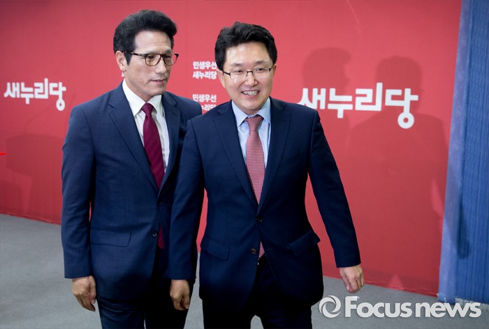 (서울=포커스뉴스) 전당대회 대표최고위원 출마를 선언한 정병국(왼쪽), 김용태 새누리당 의원이 29일 오후 서울 여의도 당사에서 단일화 발표 기자회견을 마친 뒤 퇴장하고 있다. 이날 두 의원은 여론조사를 통해 정병국 의원으로 단일화를 결정했다.