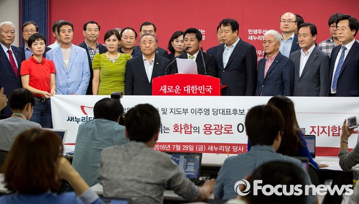 (서울=포커스뉴스) 새누리당 중앙위원회 관계자들이 29일 오후 서울 여의도 새누리당사 브리핑실에서 전당대회 당대표에 출마한 이주영 의원을 공개 지지 선언 하고 있다.