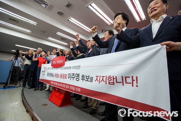 (서울=포커스뉴스) 새누리당 중앙위원회 관계자들이 29일 오후 서울 여의도 새누리당사 브리핑실에서 전당대회 당대표에 출마한 이주영 의원을 공개 지지 선언 하고 있다.
