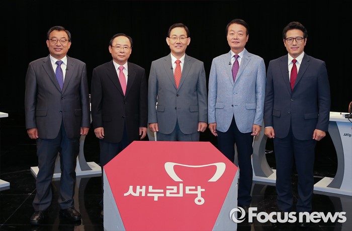 (서울=포커스뉴스) 29일 오후 서울 마포구 상암동 DMC에서 종합편성채널 채널A 주최로 열린 새누리당 대표 경선 1차 토론회에 참석한 의원들이 토론에 앞서 포즈를 취하고 있다. 왼쪽부터 이정현, 이주영, 주호영, 한선교, 정병국 의원.