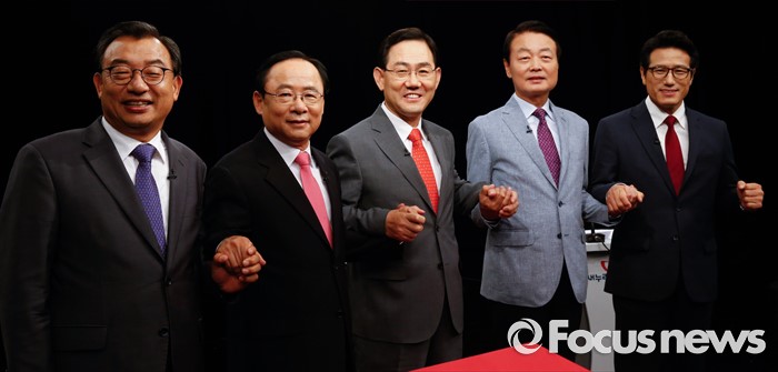 (서울=포커스뉴스) 29일 오후 서울 마포구 상암동 DMC에서 종합편성채널 채널A 주최로 열린 새누리당 대표 경선 1차 토론회에 참석한 의원들이 토론에 앞서 포즈를 취하고 있다. 왼쪽부터 이정현, 이주영, 주호영, 한선교, 정병국 의원.