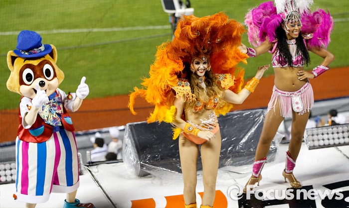(서울=포커스뉴스) 26일 서울 잠실구장에서 열린 2016 프로야구 한화-두산 경기를 찾은 브라질 무용단이 열띤 공연을 펼치고 있다.
