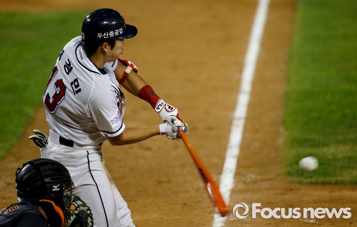 (서울=포커스뉴스) 26일 서울 잠실구장에서 열린 2016 프로야구 한화-두산 경기 5회말 1사 만루 상황에서 두산 허경민이 2타점 역전 적시타를 치고 있다.