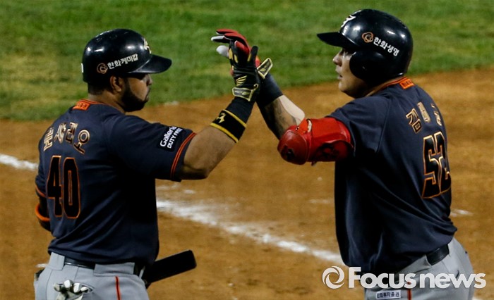 (서울=포커스뉴스) 26일 서울 잠실구장에서 열린 2016 프로야구 한화-두산 경기 7회초 2사 1,2루 상황에서 3점 홈런을 친 후 로사리오와 손뼉을 마주치고 있다.