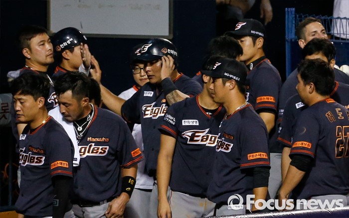 (서울=포커스뉴스) 26일 서울 잠실구장에서 열린 2016 프로야구 한화-두산 경기 9회초 2사 1루 상황에서 한화 김태균이 1타점 2루타를 친 후 더그아웃의 동료들과 손뼉을 마주치고 있다.