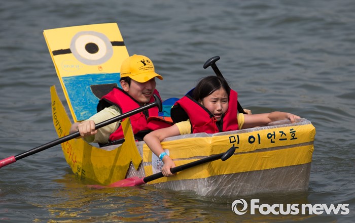 (서울=포커스뉴스) 30일 오후 서울 송파구 잠실한강공원에서 열린 한강 종이배 경주대회 '박스원레이스'에 참가한 시민들이 종이배를 타고 경주를 하고 있다.