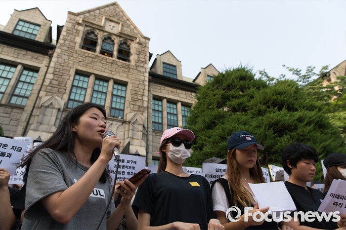 (서울=포커스뉴스) 30일 오후 서울 서대문구 이화여자대학교 본관 앞에서 고졸 출신 직장인 등을 위한 단과대 설립을 반대하는 학생들이 경찰의 폭력 진압 의혹 기자회견을 하고 있다. 이날 오후 경찰은 학교 측 요청으로 갇혀 있던 교수, 교직원을 데리고 나왔으며 이 과정에서 경찰과 재학생 간 충돌이 있었다.