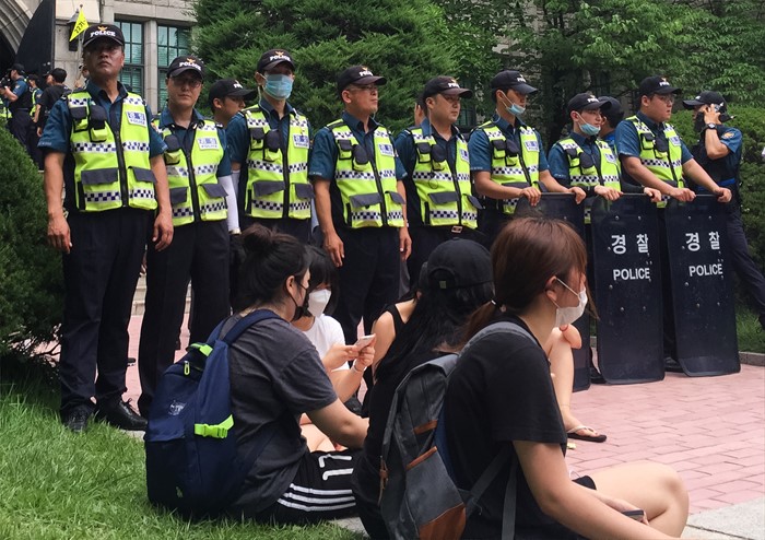 (서울=포커스뉴스) 30일 오후 서울 서대문구 이화여대 본관 앞에서 경찰들이 고졸 출신 직장인 등을 위한 단과대 설립을 반대하는 학생들과 대치하고 있다. <사진제공=이화여대 재학생>
