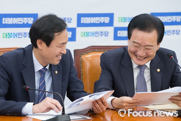 (서울=포커스뉴스) 1일 오전 서울 여의도 국회에서 열린 더불어민주당 원내대책회의에 참석한 우상호(왼쪽) 원내대표와 변재일 정책위의장이 대화하고 있다.