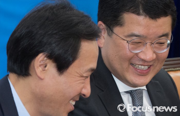 (서울=포커스뉴스) 4일 오전 서울 여의도 국회에서 열린 더불어민주당 사드대책위원회의에 참석한 우상호(왼쪽) 원내대표와 최종건 연세대 정치외교학과 교수가 대화하고 있다.