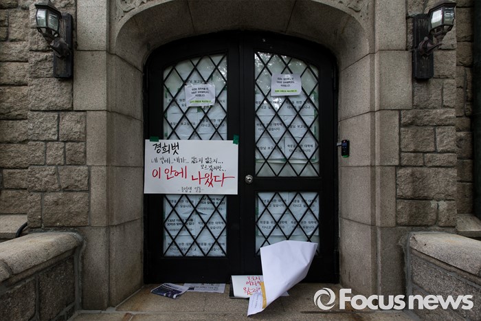 (서울=포커스뉴스) 2일 오전 서울 서대문구 이화여대 본관 건물에 미래라이프 단과대학 설립에 반대하는 문구가 부착돼 있다.