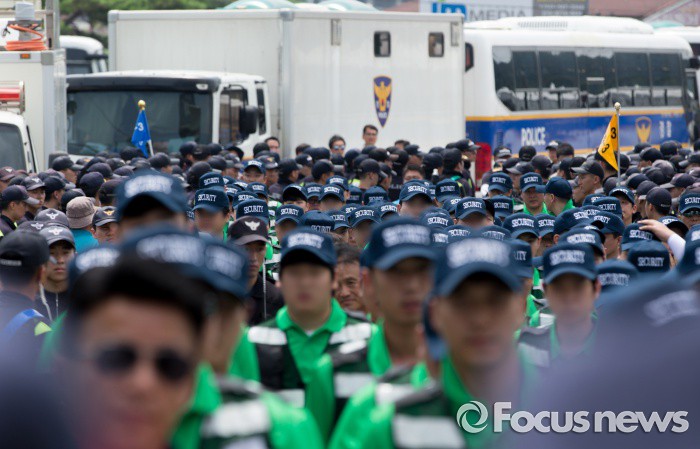 (아산=포커스뉴스) 1일 오후 충남 아산 탕정면 갑을오토텍에서 노조원들과 사측 경비 용역들이 대치하고 있다.