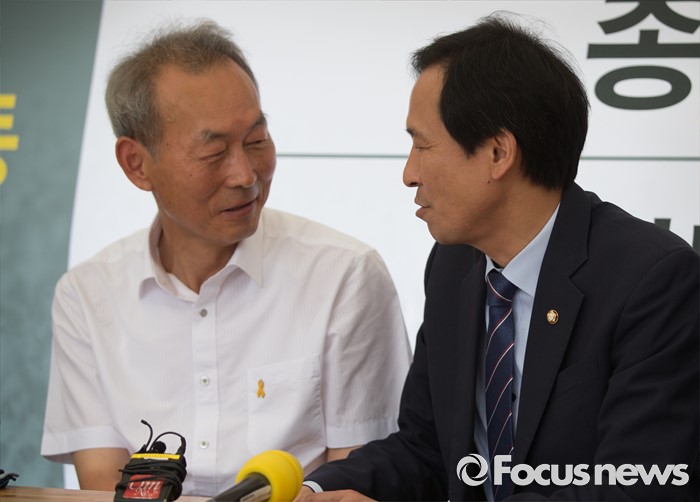 (서울=포커스뉴스) 1일 오전 서울 종로구 광화문 광장에서 단식농성중인 이석태(왼쪽) 세월호 참사 특별위원장과 우상호 더불어민주당 원내대표가 대화를 나누고 있다.