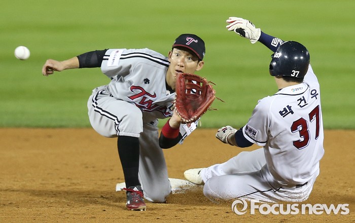 (서울=포커스뉴스) 3일 서울 잠실구장에서 열린 2016 프로야구 LG-두산 경기 4회말 2사 1,2루에서 더블스틸을 시도한 두산 1루주자 박건우가 2루에서 세이프되고 있다.