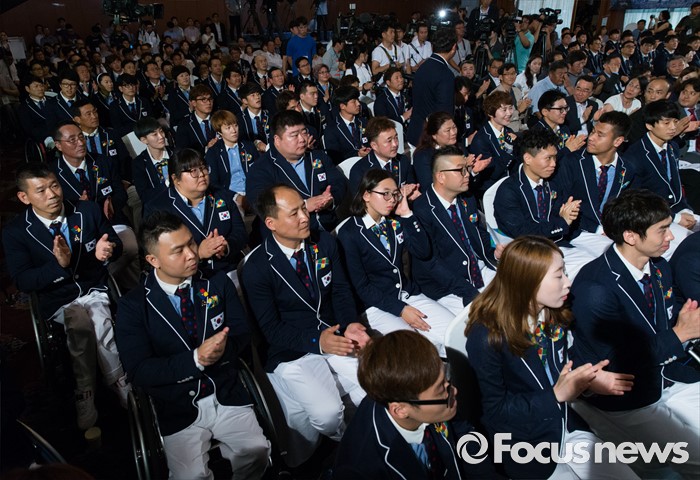(서울=포커스뉴스) 2일 오후 서울 송파구 올림픽파크텔에서 열린 2016 리우 패럴림픽 대한민국 선수단 결단식에 참석한 선수단이 박수치고 있다.