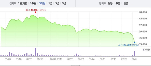 한편, YG엔터테인먼트는 자회사 YG PLUS를 통해 YG프라이빗에쿼티(PE)를 설립하는 등 투자 사업에 나선다. YG프라이빗에쿼티(PE)는 문화콘텐츠 등 다양한 방면의 투자를 할 계획이다주가흐름<사진출처=네이버 캡쳐>