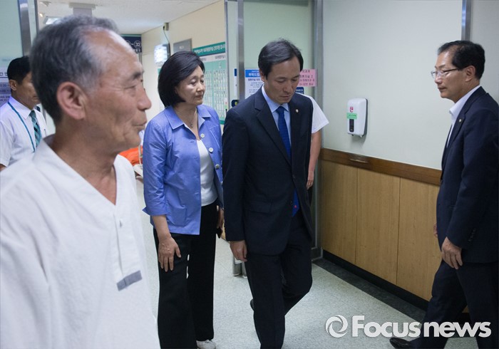 (서울=포커스뉴스) 우상호(오른쪽 두번째) 더불어민주당 원내대표와 박영선(왼쪽 두번째) 의원이 3일 오후 종로구 서울대학교병원을 찾아 지난해 민중총궐기 당시 경찰의 물대포를 맞고 입원 중인 백남기 농민을 위로 방문한 뒤 나서고 있다. 왼쪽 첫번째는 정현찬 백남기대책위 공동대표.