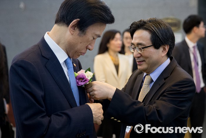 (서울=포커스뉴스) 3일 오전 서울 여의도 국회 의원회관에서 열린 공공외교법 발효기념 심포지엄에 참석한 신동익(오른쪽) 외교안보연구소장이 윤병세 외교부 장관의 재킷에 꽃을 달아주고 있다.