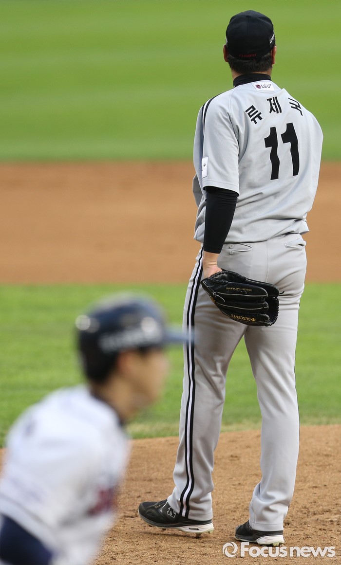 (서울=포커스뉴스) 3일 서울 잠실구장에서 열린 2016 프로야구 LG-두산 경기 1회말 LG 선발투수 류제국이 두산 선두타자 박건우를 볼넷으로 진루시키고 있다.