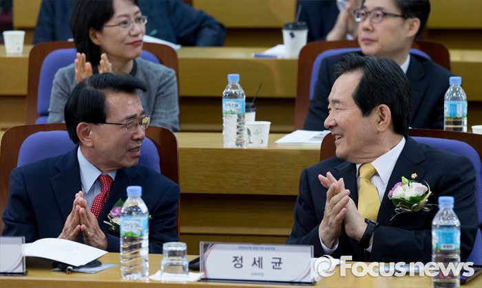(서울=포커스뉴스) 3일 오전 서울 여의도 국회 의원회관에서 열린 공공외교법 발효기념 심포지엄에 참석한 정세균(오른쪽) 국회의장과 심재권 국회 외교통일위원장이 대화하고 있다.