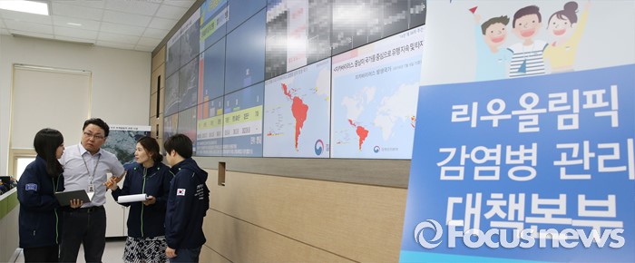 (청주=포커스뉴스) 2016 브라질 리우올림픽을 앞둔 1일 오후 충북 청주 흥덕구 오송 질병관리본부에 설치된 리우올림픽 감염병 대응 긴급상황실에서 관계자들이 지카바이러스 감염병 발생 동향 등을 살피고 있다.