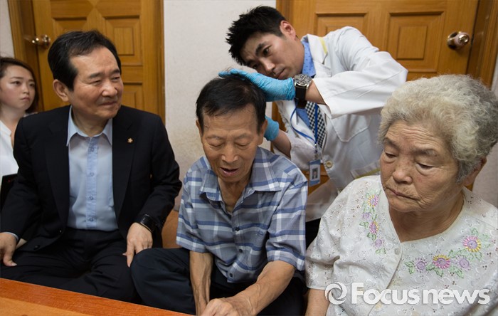 (서울=포커스뉴스) 정세균 국회의장이 2일 오전 서울 종로구 창신동에 거주하고 있는 고령 이산가족 김문각 할아버지(84세, 평안남도 양덕군 청계리) 가정을 방문해 이산가족 상봉 준비를 위한 김 할아버지의 유전자 채취 과정을 지켜보고 있다.