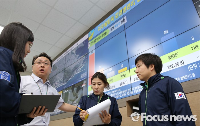 (청주=포커스뉴스) 2016 브라질 리우올림픽을 앞둔 1일 오후 충북 청주 흥덕구 오송 질병관리본부에 설치된 리우올림픽 감염병 대응 긴급상황실에서 관계자들이 지카바이러스 감염병 발생 동향 등을 살피고 있다.