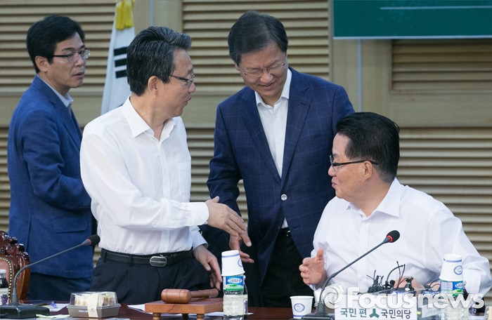 (서울=포커스뉴스) 2일 오전 서울 여의도 국회 의원회관에서 열린 국민의당 의원총회에 참석한 박지원(오른쪽 첫번째) 비상대책위원장과 김성식(왼쪽 두번째) 정책위의장, 천정배(오른쪽 두번째) 전 공동대표가 인사하고 있다.
