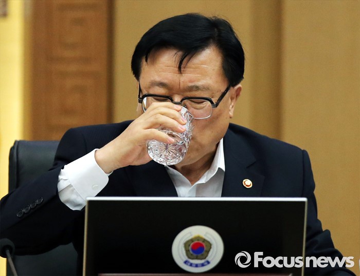 (세종=포커스뉴스) 2일 오전 세종시 정부세종청사 국무회의장에서 열린 청와대-세종 영상 국무회의에서 이동필 농림축산식품부 장관이 목을 축이고 있다.