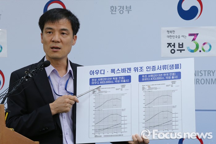 (세종=포커스뉴스) 홍동곤 환경부 교통환경과장이 2일 오전 세종시 정부세종청사 환경부 기자실에서 위조서류로 불법인증을 받은 폭스바겐 32개 차종(80개 모델)에 대해 인증취소 처분을 내렸다고 밝히고 있다.