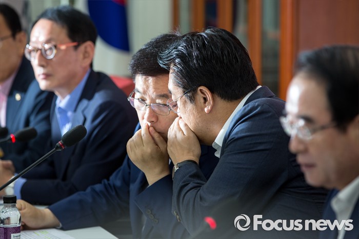 (서울=포커스뉴스) 정진석(오른쪽 두 번째) 새누리당 원내대표와 김광림(오른쪽 세 번째) 정책위의장이 2일 오전 서울 여의도 국회에서 열린 원내대책회의에 참석해 의견을 나누고 있다.